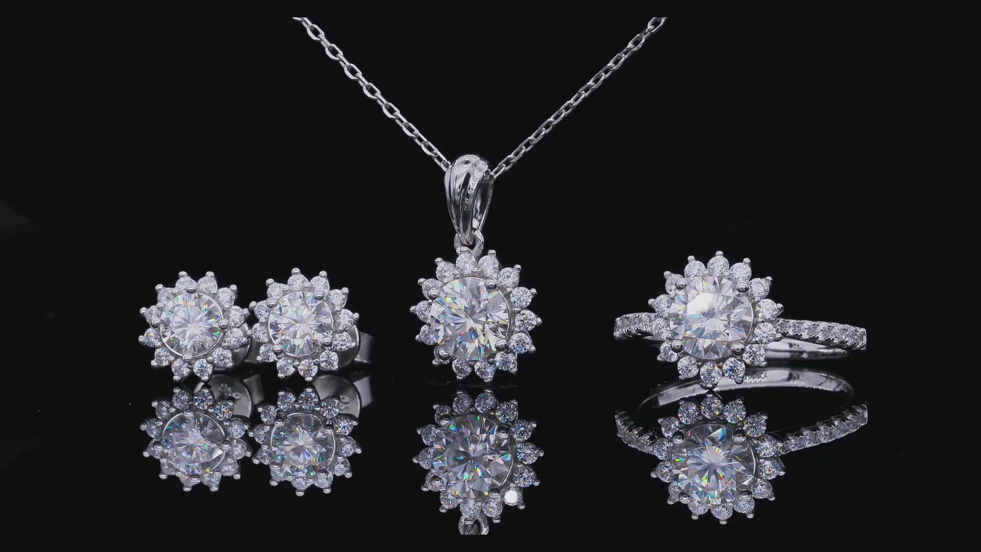 Sterling Silver Celestial Flower Moissanite Hypoallergenic Stud Earrings + Necklace